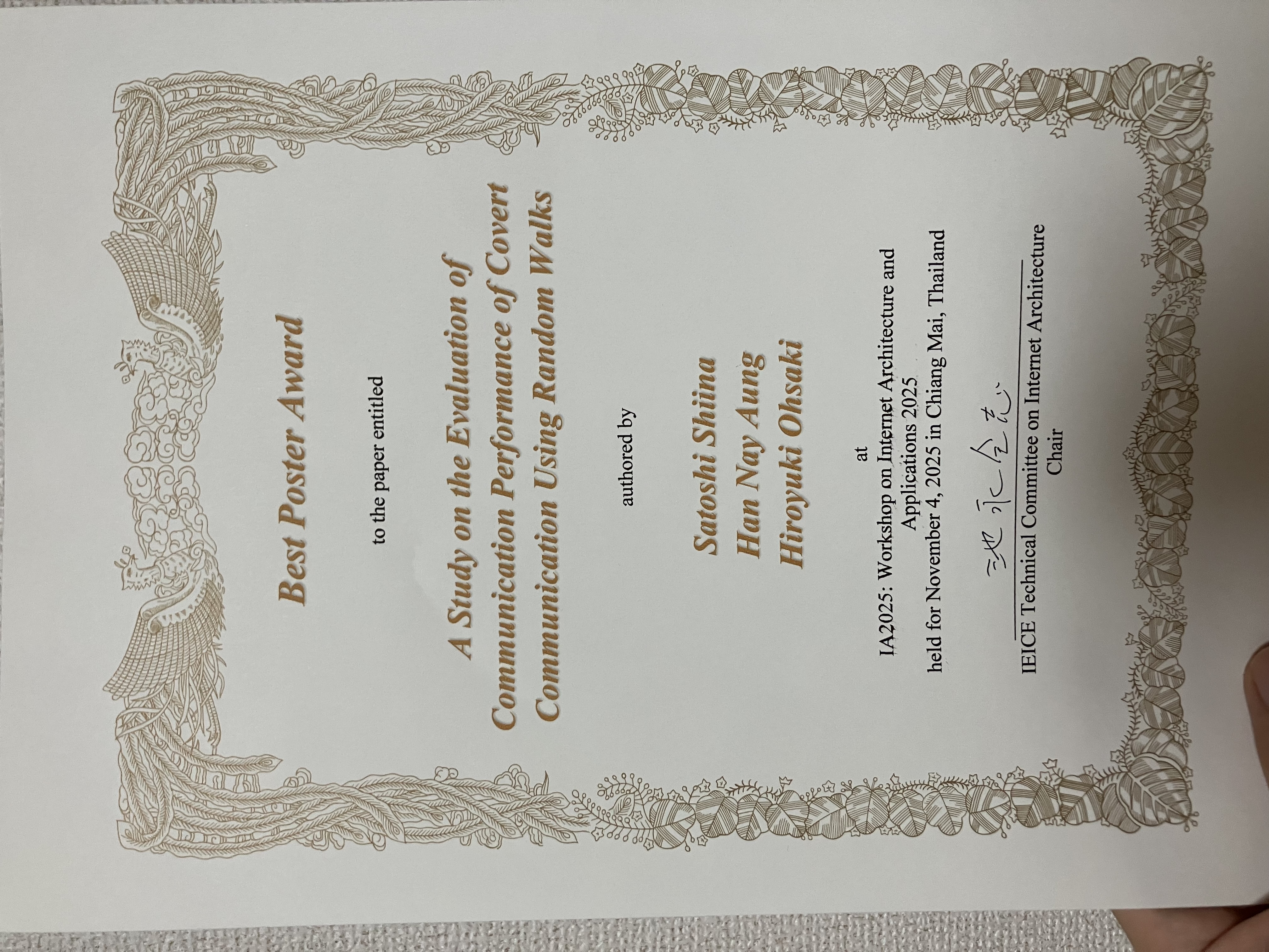 IA2025 - Workshop on Internet Architecture and Applications 2025 で Best Poster Award を受賞しました。